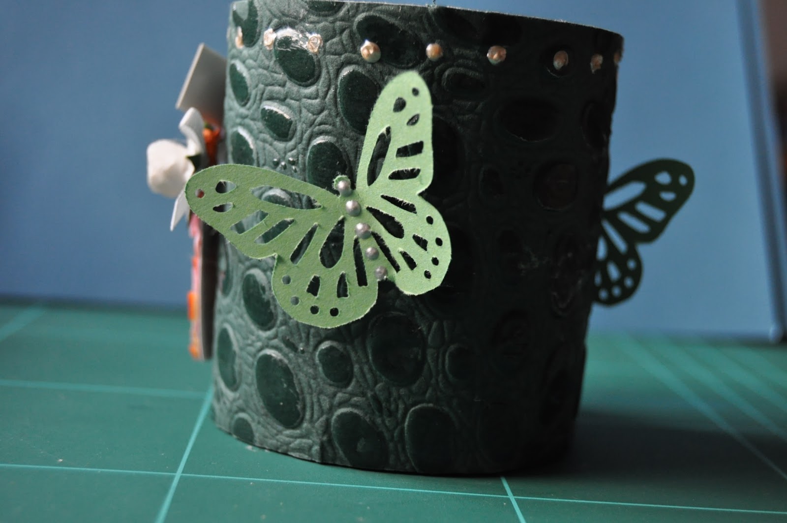 La decoré totalmente con papeles y troqueles scraperos. Sobre un papel del famoso "tacopapeles de María", le puse en la parte de arriba un troquel de bordes que me gusta mucho porque hace el efecto de una puntilla. Luego pequé un troquel de un maniquí (a ella le gusta mucho la costura: patchwork, fieltro....) adornado con unos brillantitos en la cintura y liquid pearl en el resto del motivo. En los laterales iban unas mariposas de Martha Steward.