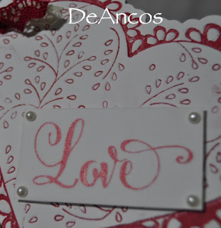 El mensaje "Love", un sello de SoSuzyStamps, está entintado igualmente con Stazon Black Cherry sobre vellum pegado a un trozo de cartulina blanca pegada con cinta 3D sobre el corazón. El último toque lo dan las perlitas que pegué sobre el vellum.