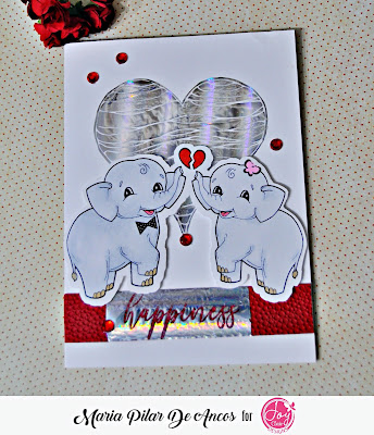 Los que me conocéis ya os habéis dado cuenta de que guardo restos de materiales para utilizarlos en los diversos proyectos. Esta es una de esas ocasiones. Utilicé el negativo del foil utilizado en una tarjeta anterior y lo combiné con imágenes digitales impresas. Me encanta utilizar sellos digitales por la libertad que te dan a la hora de diseñar. Por ejemplo, estos elefantes parecen estar muy enamorados a pesar de ese corazón roto que tienen encima. Por este motivo puse como fondo de la tarjeta el gran corazón el foil holográfico.